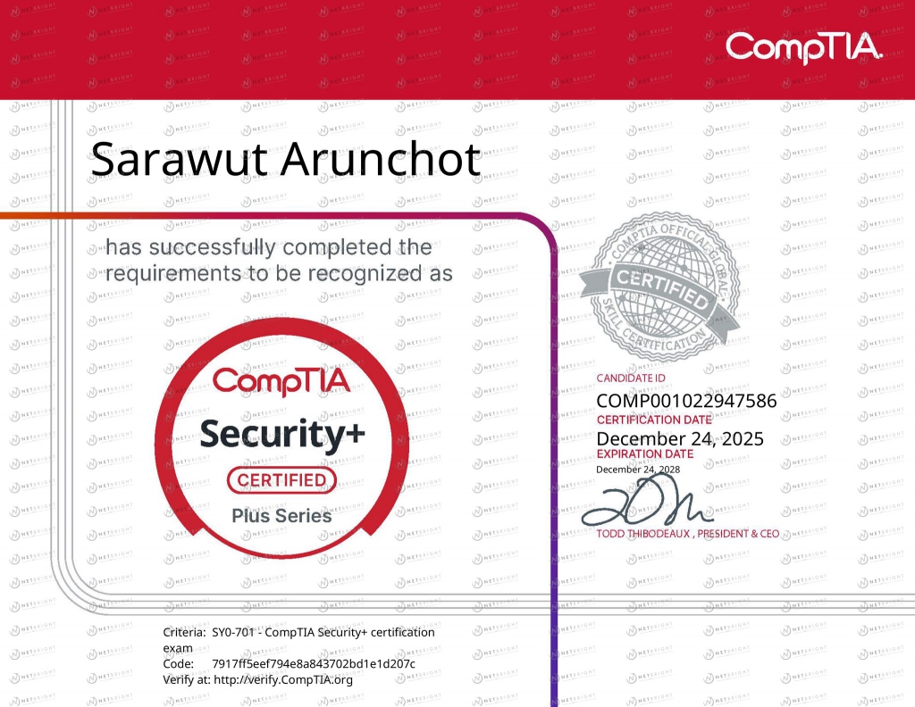 January 15, 2026in Uncategorized0by netbright114 📌Update Certified : CompTIA📌 ทีม Net Bright ได้รับ Certificate ล่าสุดCompTIA Security+ Certification (Entry-Level)#CompTIA #Security ปรึกษาทีมงานผู้เชี่ยวชาญจาก Net Bright Co.,Ltd. ทักเลยค่า สอบถามโซลูชั่นเพิ่มเติม : Website: https://www.netbright.co.th/ E-mail : sales@netbright.co.th Tel : +662643-8810-11 Mobile : +6697-039-3161 Line : @netbright Facebook : @netbright.th Instagram : netbright.th Youtube Channel : Net Bright Linkedin : netbright-th